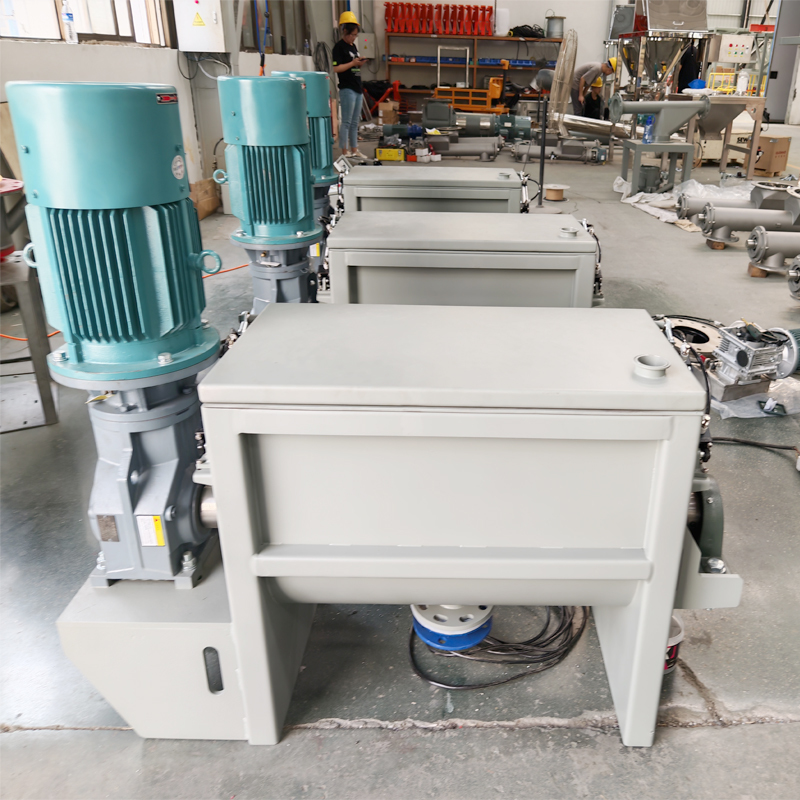 Cuando el equipo está en funcionamiento, las correas helicoidales interior y exterior giran a velocidades diferentes.La cinta helicoidal exterior empuja el material desde ambos extremos del recipiente de mezcla hacia el área centralLa banda helicoidal interna transporta el material desde el área central a ambos extremos, lo que crea una circulación convectiva forzada del material dentro del recipiente.Este patrón de movimiento bidireccional de empuje permite que el material se mezcle rápida y uniformemente a través de un corte continuoIncluso para materiales con diferencias significativas de densidad, alta viscosidad o gran capacidad, puede lograr el efecto de mezcla deseado en un tiempo relativamente corto,y también puede reducir la mezcla de zonas muertas, asegurando la consistencia de la mezcla de materiales.