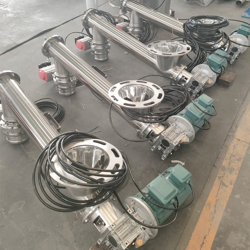 2.El transportador de tornillo horizontal con 3 salidas, cada salida equipado con una válvula mariposa, cuando se necesita llenar una bolsa a granel, sólo tiene que abrir esa válvula mariposa